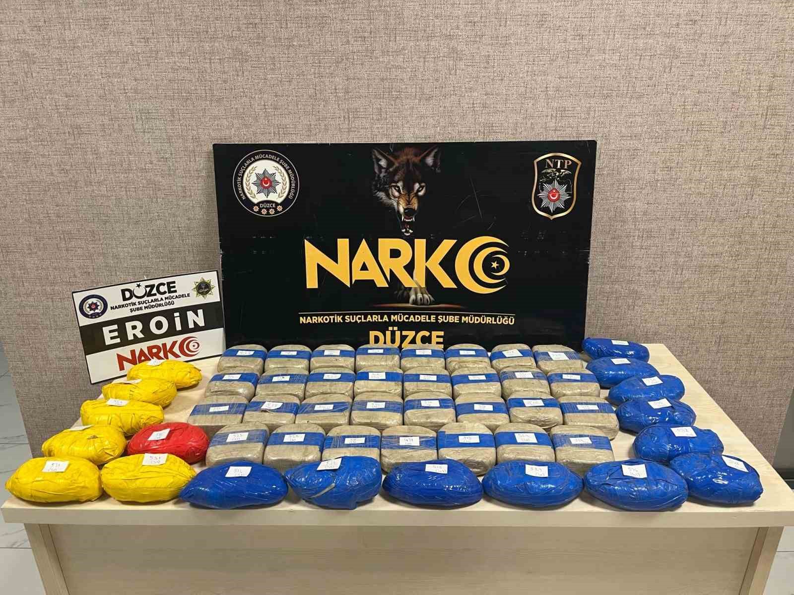 Düzce’de polis ekiplerinin düzenlediği operasyonla bir minibüsün internet portal kutusunun içerisinde, piyasa değeri 10 milyon TL olan 25 kilo eroin geçirildi.