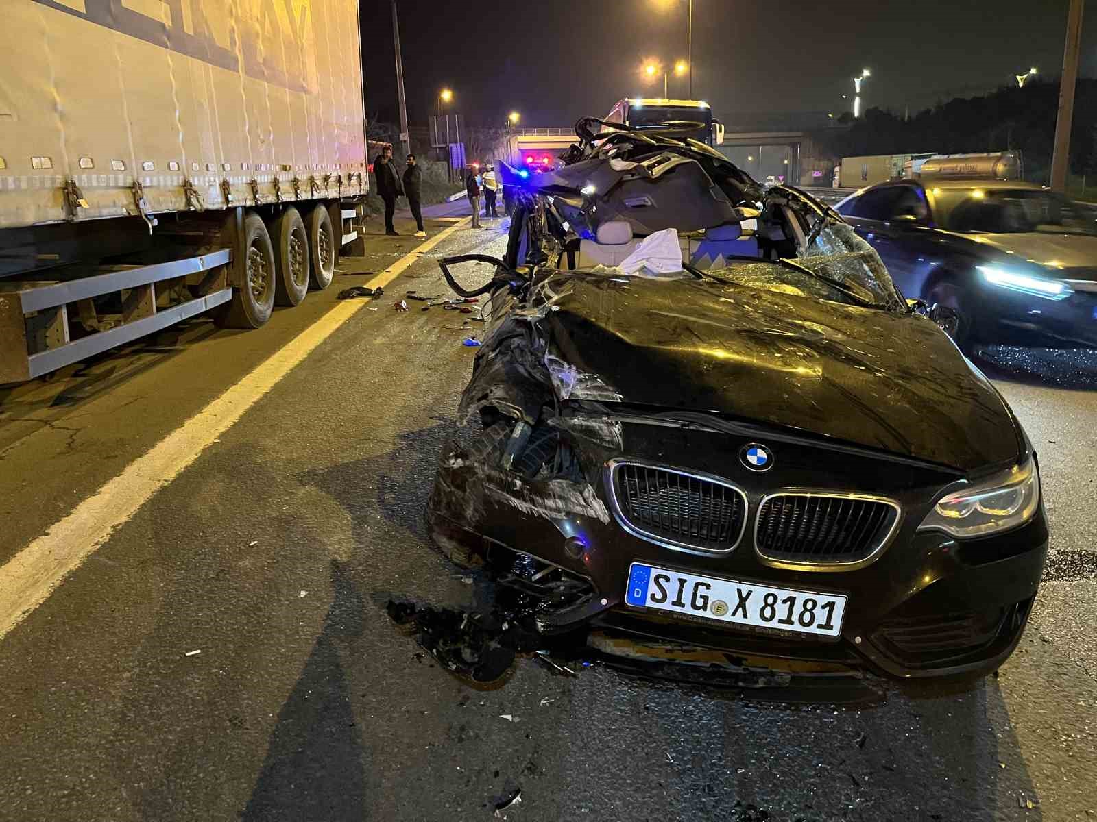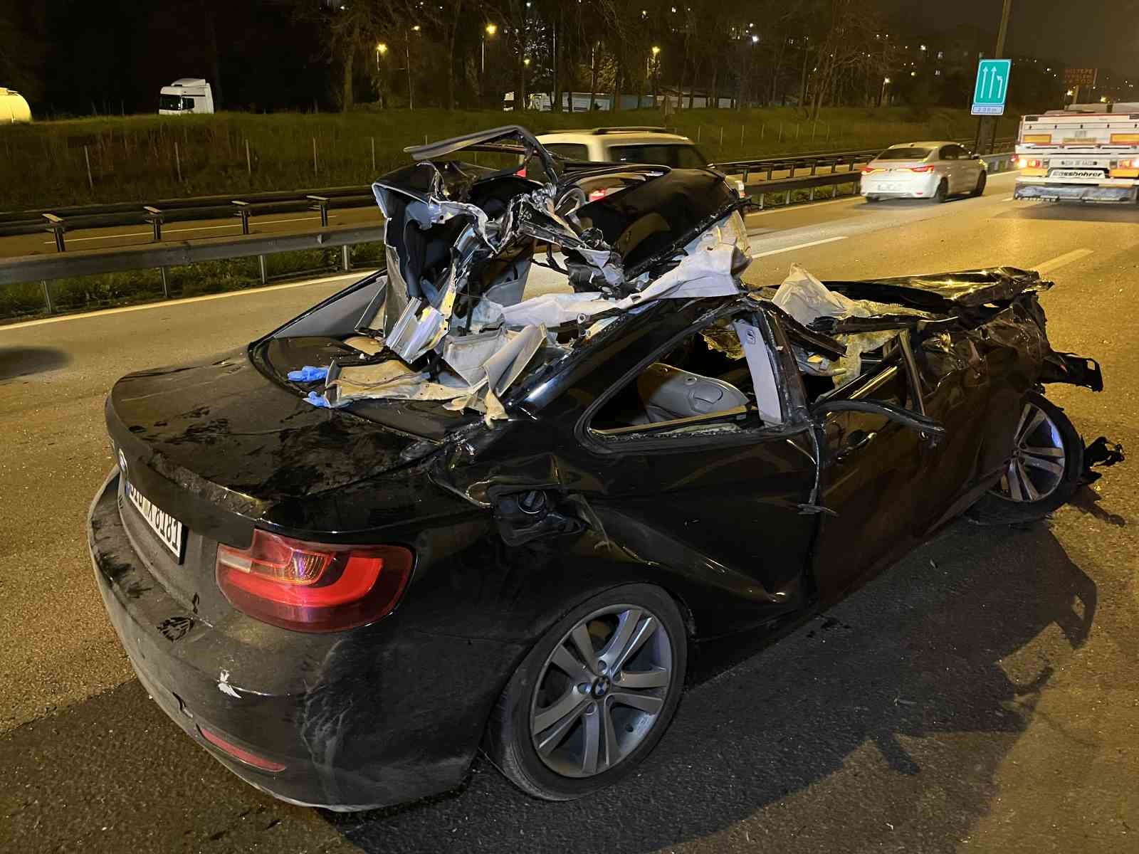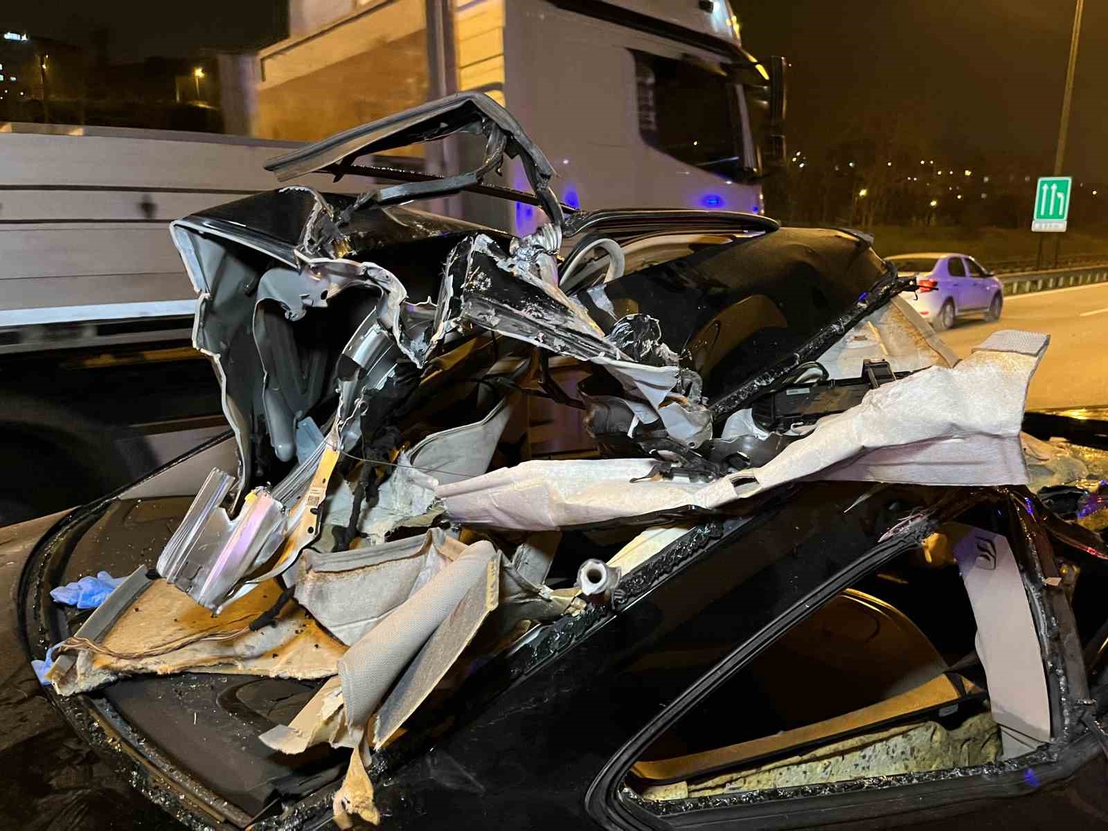 TEM’de tıra çarpan otomobilin tavanı koptu: 1 ölü, 2 yaralı