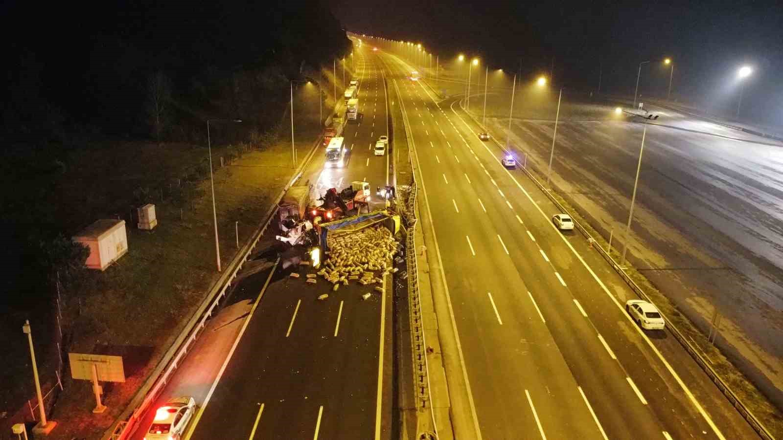 Anadolu Otoyolu Düzce geçişinde tır ile kamyon çarpıştı. Otoyolun İstanbul istikameti trafiğe kapanırken, yolu açma çalışmaları havadan dron ile görüntülendi.